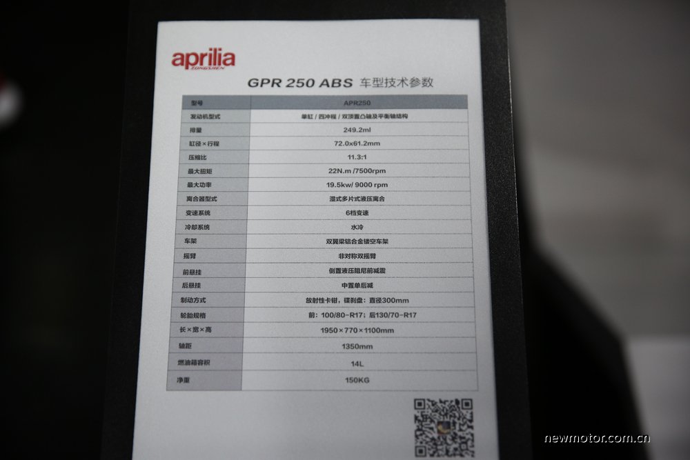 Soal spesifikasi mesin Aprilia GPR250 ialah berkapasitas 250cc Injeksi, berpendingin cairan dan punya transmisi manual 6 percepatan. Power motor ini berada diangka 19,5 KW diputaran mesin 9.000 RPM dan torsi 22N.m diputaran mesin 7.500 RPM.