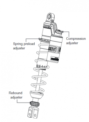 - Terdapat 3 penyetelan yakni spring preload adjuster, compression adjuster dan rebound adjuster.