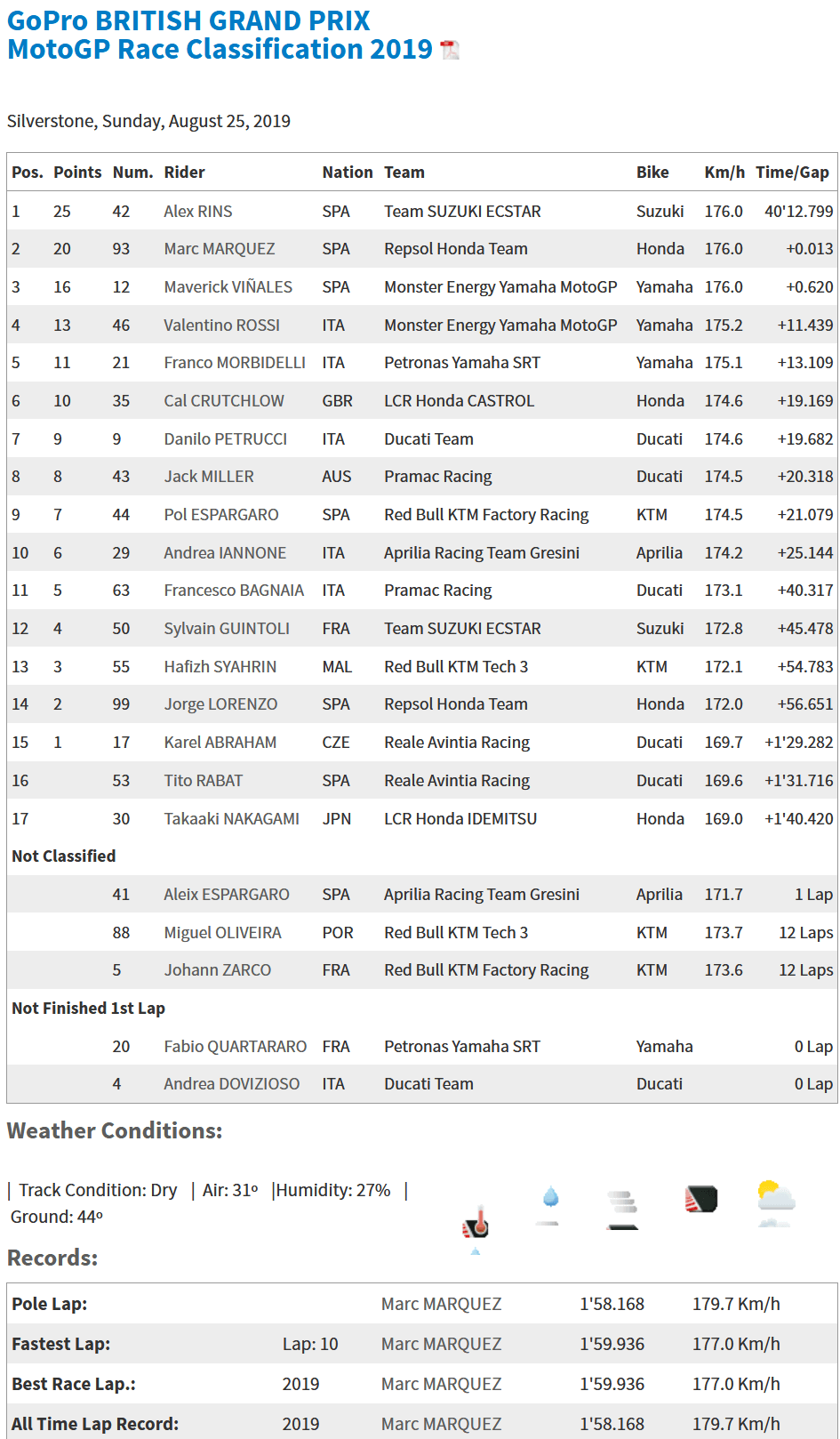 Balapan MotoGP Silverstone 2019 kelar dan Alex Rins keluar sebagai juara pertama, Marquez kedua, Vinales ketiga, Rossi keempat dan Morbidelli menjadi penutup lima besar. Selamat Alex Rins, akhirnya Juara 1 !!