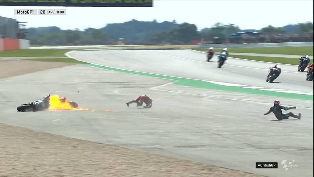 Lap #1 Marc Marquez melesat kencang dari start terdepan di MotoGP Inggris 2019. Tidak lama setelah dimulainya balapan ternyata terjadi insiden crash ditikungan pertama dimana insiden tersebut melibatkan rider Quartararo dan Dovisiozo. Motor Dovi, Desmosedici GP19 terbakar begitu ngeri teman teman.