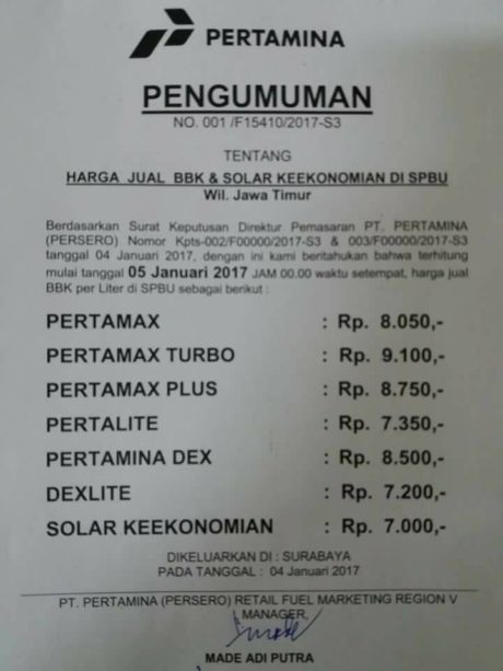 Dari surat pengumuman No. 001/F15410/2017-s3 tentang harga jual BBK & Solar wilayah Jawa Timur diperoleh kepastian bahwa akan ada kenaikan harga BBM pertanggal 5 atau tepatnya mulai tadi malam pukul 00.00. Kanaikannya sih tidak terlalu besar,rata-rata berkisar 300 rupiah/liter.