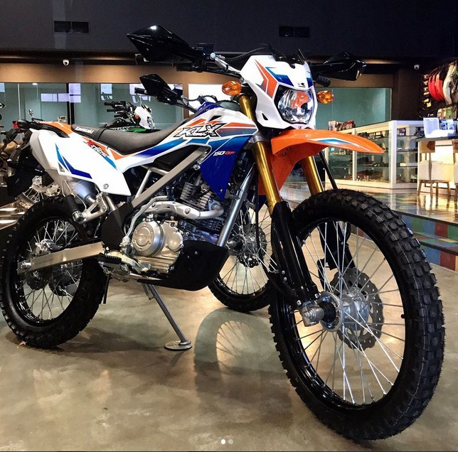 Jika KLX150BF SE (special edition) terdapat 3 pilihan warna yakni Hitam,Hijau dan kuning. Maka untuk Kawasaki KLX150BF Xtream ini hanya terdapat satu warna saja yakni putih. Eits,,tapi enggak putih biasa…akan tetapi putihnya itu sebagai warna dasar,nah pada sekujur bodynya disematkan striping berwarna biru dan orange.
