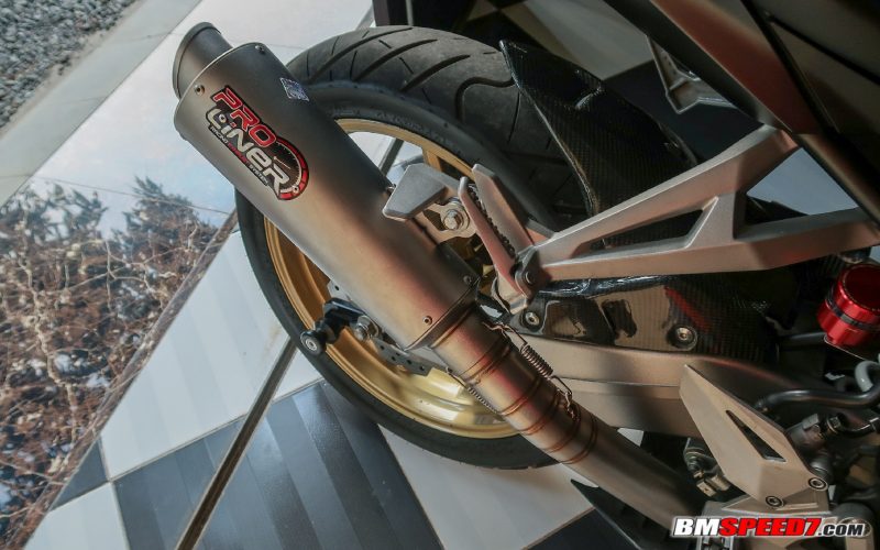 Lagi lagi ini kelebihan dari Proliner, pipa sudah menganut sistem bending alias ditekuk menggunakan mesin. Dengan begitu terlihat lebih rapi, presisi dan safety. Pernah ada postingan di grup (lupa namanya euy) jadi headernya patah lantaran masih menggunakan las cacing dan bukan dibending seperti ini. Padahal pada area tersebut yang pertama menerima panas dan getaran dari mesin. Jadi kalau milih knalpot full system, lebih baik headernya sudah dibending.