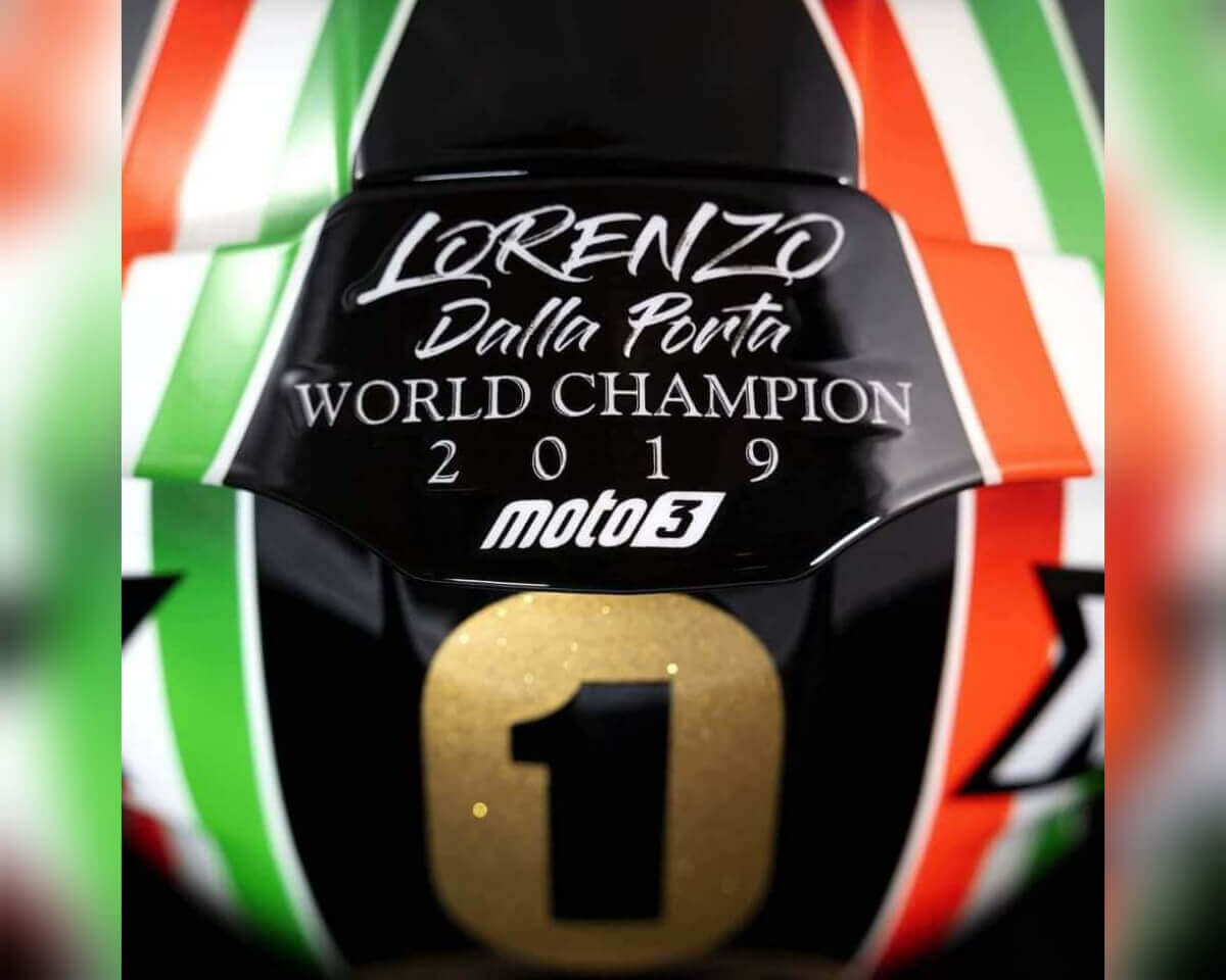 Pembalap asal Italia itu merupakan juara dunia Moto3 2019 lalu. Warna emas juga pernah diaplikasikan ke helm AGV Pista GP-R Joan Mir saat menjadi juara dunia Moto3 di 2017. Ya sama-sama dari tim Leopard Racing, pun dibuat lewat desainer helm kondang asal Italia, Starline Design.