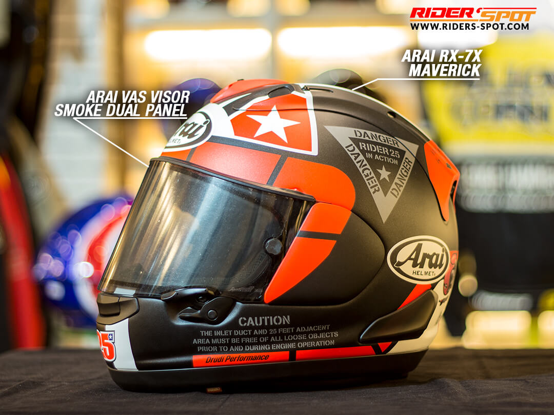 Ini juga cocok dipasang di motif rame seperti Arai Haga, Arai RX7X Tatsuki Suzuki, Nakagami GP2, AGV Rossi (kan banyakan rame tuh motifnya) dan lain sebagainya. Kalau di helm sih semakin rame motif biasanya malah disukai, tapi kembali ke perpaduan perpaduan warna dan motifya itu sendiri.