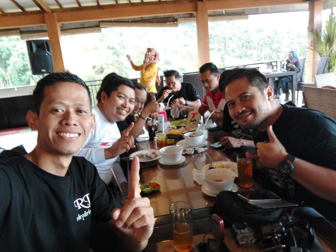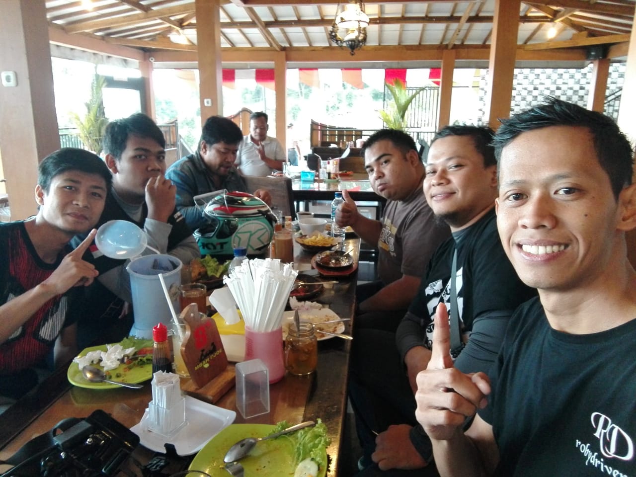Dan namanya touring pakai motor sudah tentu melelahkan dan haus, kami istirahat 2 kali, pertama di Indomaret Karanganyar untuk sekedar minum dan makan makan ringan dan yang kedua istirahat di Mbah Djoe Resort untuk makan siang. Ditempat inilah blogger SatuAspal dan CahBrogo gabung dengan kami.