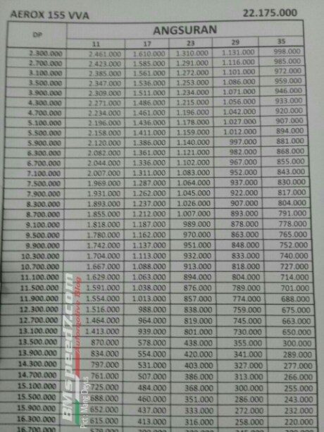 DP aka uang muka terendah diangka Rp 2.300.000 dengan tenor dimulai dari 11 kali hingga 35 kali pembayaran Tiap bulannya.