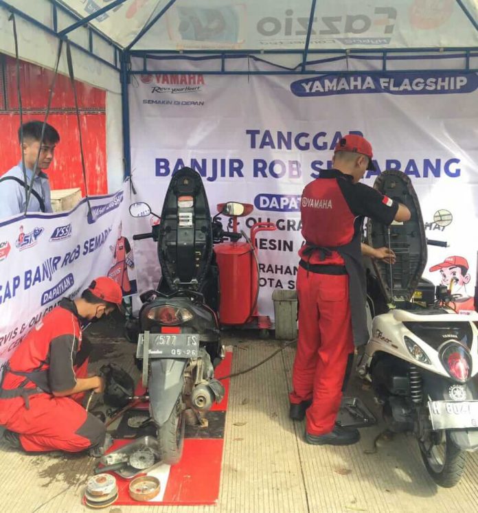 Yamaha mendirikan tempat service di Kelurahan Tanjung Mas Semarang, dimana merupakan kelurahan yang terkena banjir rob. Menariknya, yang diservice bukan cuma merek Yamaha saja lho, tapi semua merek dilayani,mantap!.