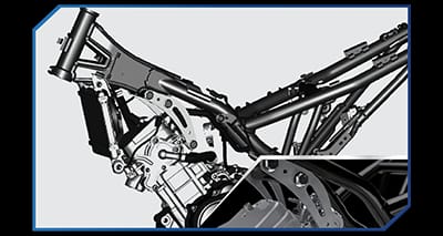 Kemudian untuk rangka atau chasis, Yamaha telah merombak agar sesuai dengan desain dan mesin yang baru berbentuk Y yang menjamin tetap rigid. Yang menarik, rangka baru ini mempunyai dudukan mesin dengan ketebalan 4,5 mm yang dipasang ke kepala silinder. Menurut Yamaha supaya tetap stabil ketika berjalan pada kecepatan tinggi di semua sudut.